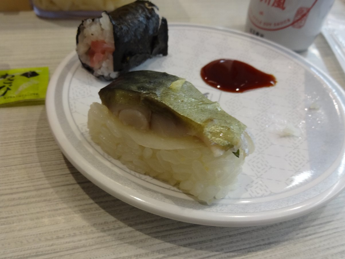 前回「かなり酷い」出来だった「バッテラ」も試しに一皿のみ注文していましたが「鯖」の大きさは戻っていました