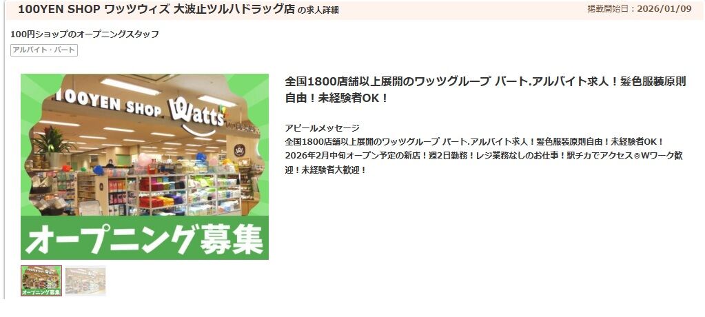 調べると100円ショップの「ワッツウィズ 大波止ツルハドラッグ店」もオープニングスタッフを募集していました