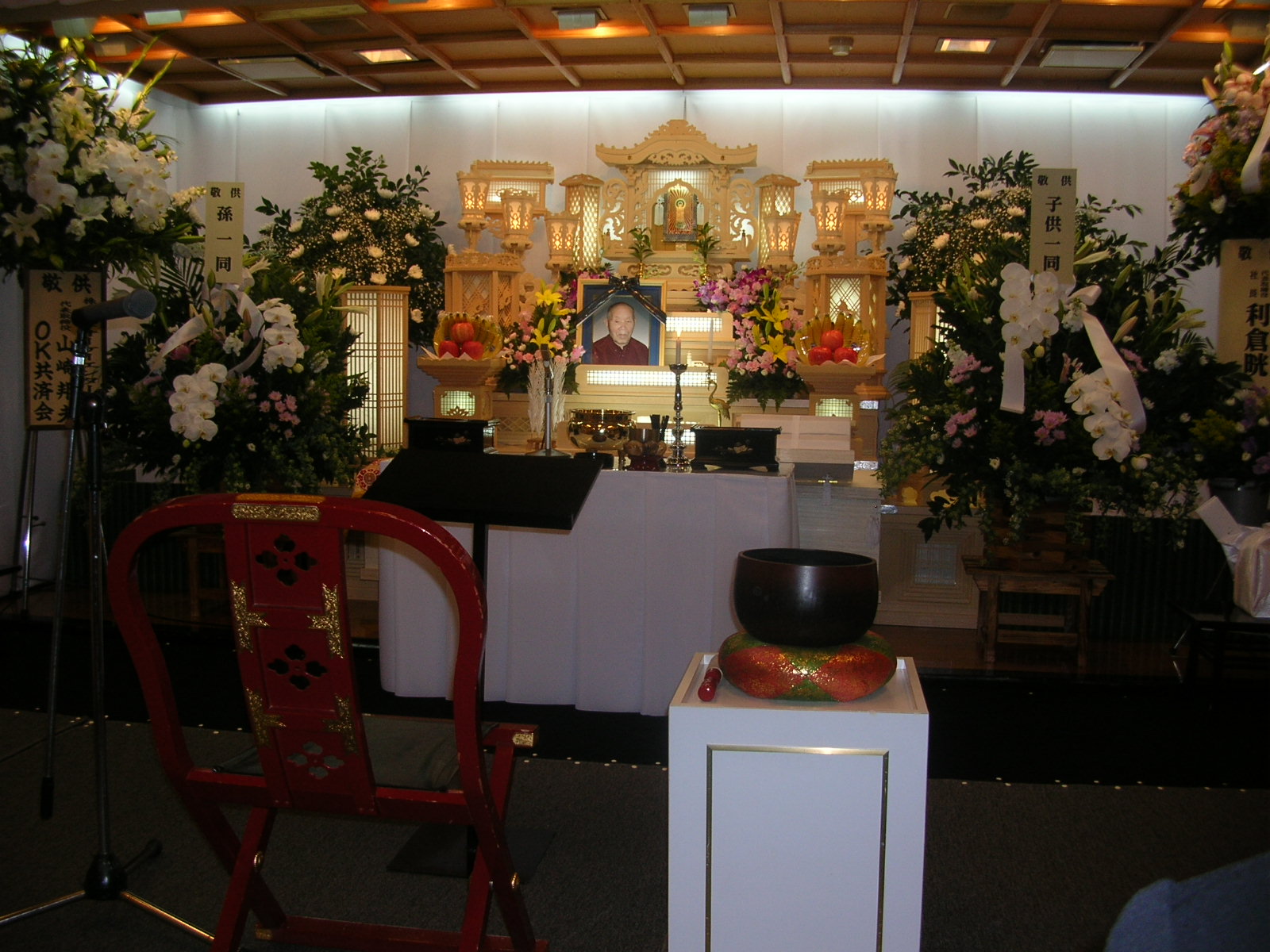 葬儀社の人が手際よく祭壇を飾ったあと花屋が供花を持ってくると、それなりに形が整ってきました。しかし、やることはあまり無いんですよね、次々と届く弔電の中で読み上げるのを選んどいてください、と係りの人から言われたんですが、まだまだ全部は届いていませんし、せいぜい読んで貰いそうな電報に振り仮名を振るくらい・・・ビールや酒も持ち込みましたがそんなに飲むわけにも行きませんし、お茶ばかり飲んでいました。