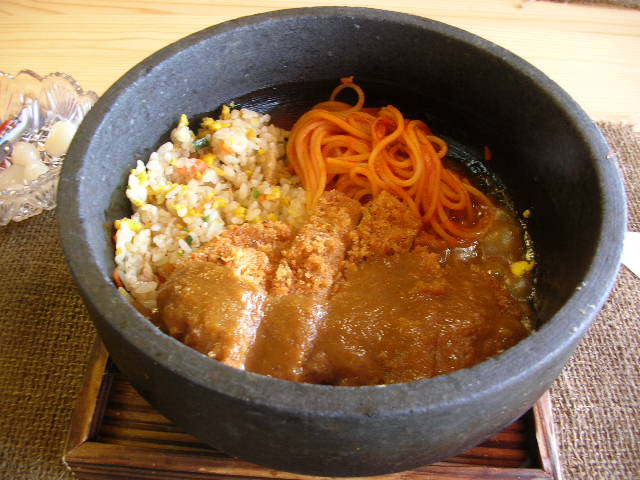 神崎さんの「トルコライス マニアックス」で紹介されていた県営バスターミナルの中2階にある「カレーの原石」で石焼きトルコライスを食べることにしました。しかし本当に石焼きカレーの専門店?前の店の(改装したみたいなので)キャッチフレーズじゃないのかな?なにせ一番目立つのが5〜600円くらいの各種定食とチャンポンですもの・・・一応「石焼きトルコライス」もあったのでそれをチョイス石焼きに時間がかかるのか結構待たされました・・・確かにピラフ+カツカレー+ナポリタンのトルコライスで美味しかったんですが、何故石焼きにする必要があるのかはわかりませんでした・・・・熱々のカツカレーはホント美味しかった(^^)v