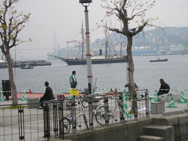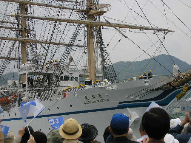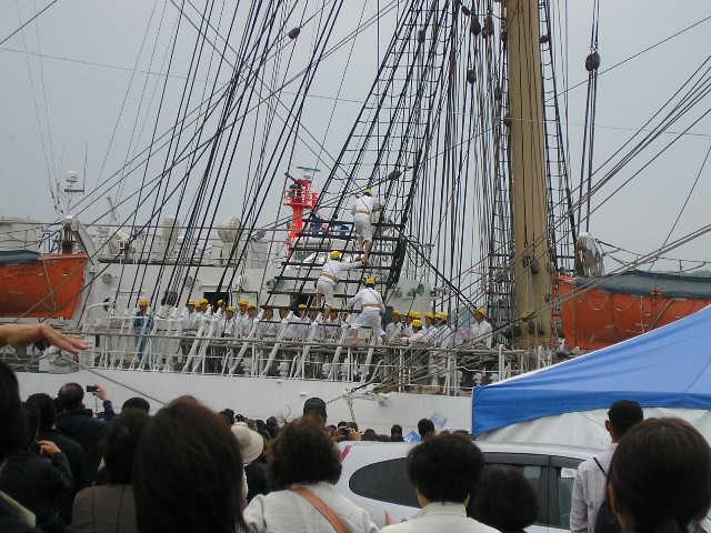 今日は日本丸・コリアナ・観光丸の出航ですが「日本丸」はおなじみ登檣礼(とうしょうれい)を見ることが出来るのですごい人出です。