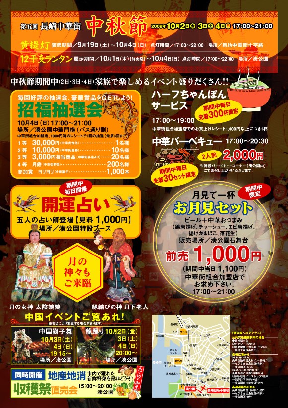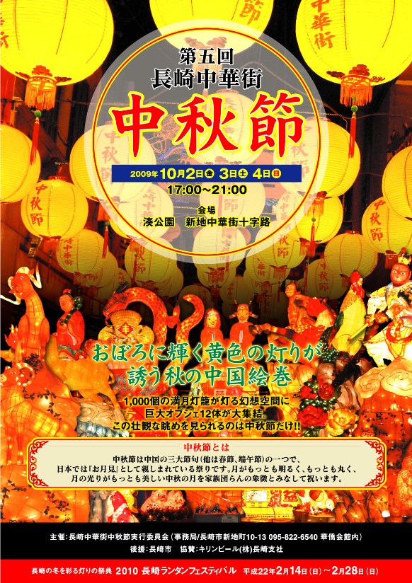 朝日新聞の記事によると文明堂の中川社長の音頭をとって「料亭 青柳」「グラバー園」「長崎歴史文化博物館」と連携して「長崎ムーンライトフェスティバル」として開催しているみたいです・・・でも上のポスターでは中華街以外のことには全く触れていないですね。