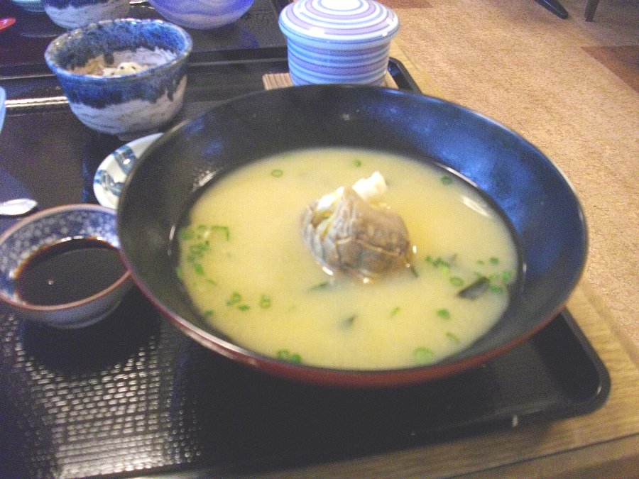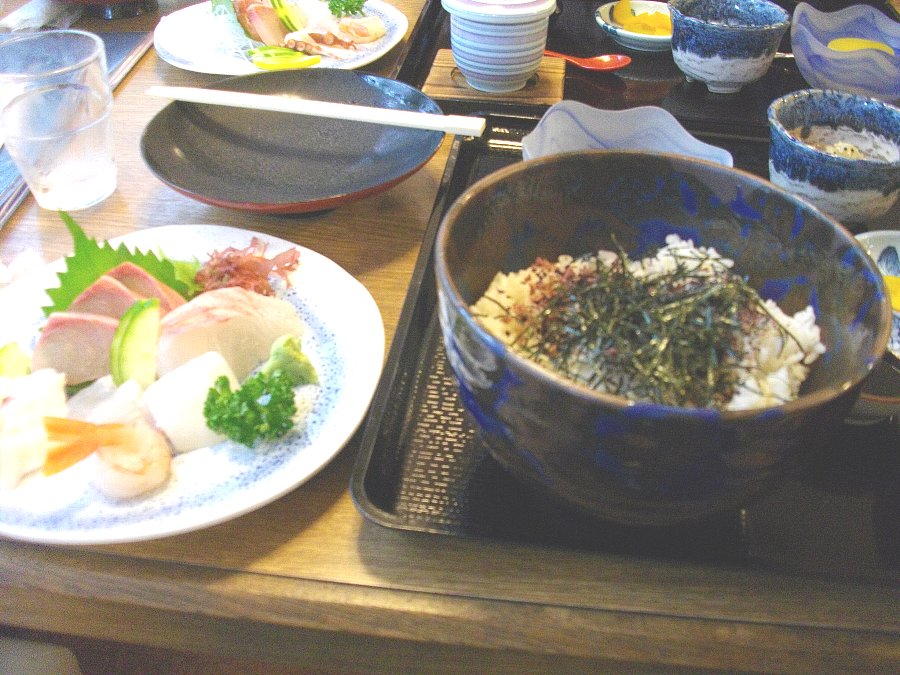 でもご飯と刺身を別盛りにしたのじゃ「丼」とは呼べないでしょう、それにご飯に載っている海苔はともかくふりかけが邪魔ですね・・・あらかぶのみそ汁の代わりにウチワエビのみそ汁でした