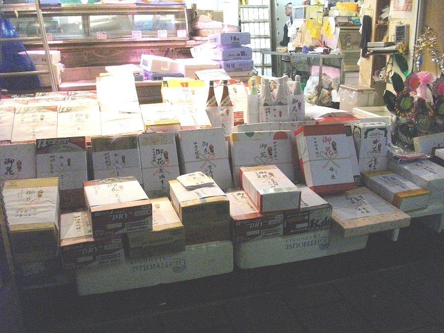 思案橋横丁から銅座市場に向かうといきなり角の魚屋さんで庭見せ・・・というより戴いた「花」を展示して隣ではお酒を立ち飲み(^^)