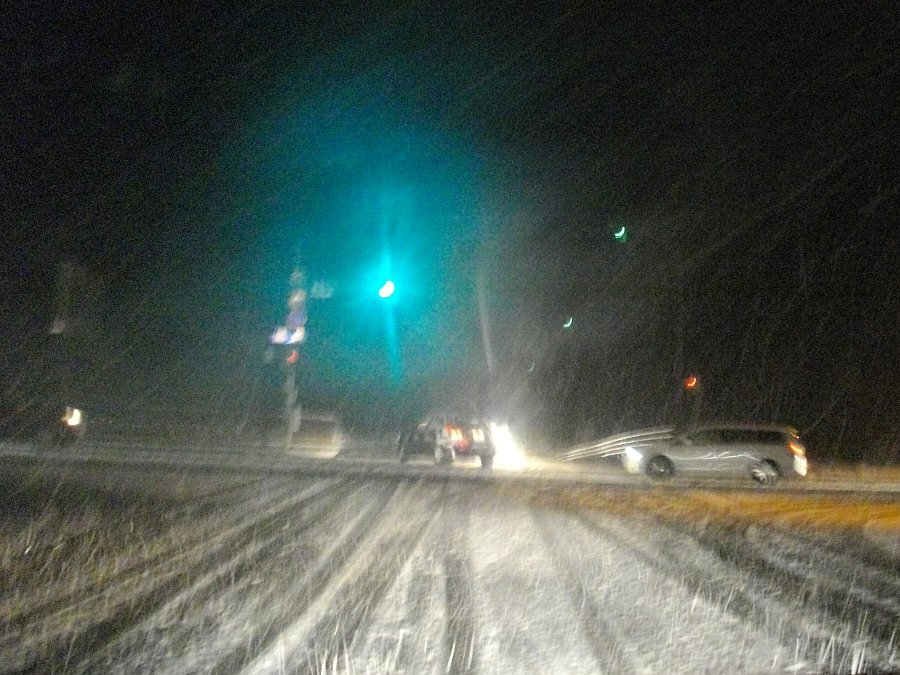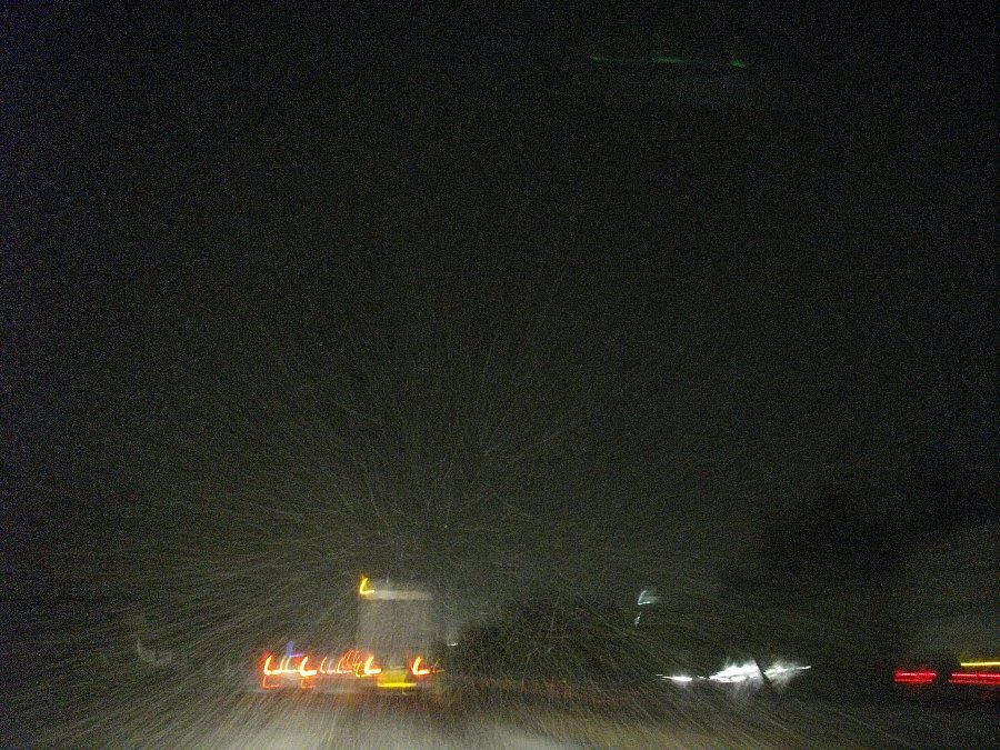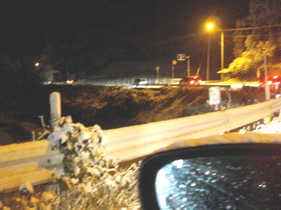 いつもより早く午後6時半には福岡を出て古賀から九州道に乗ったのですが早くも福岡インターを過ぎたあたりから雪がちらつきだしました・・・私は兄と酒を飲んだので運転は娘に任せました。
