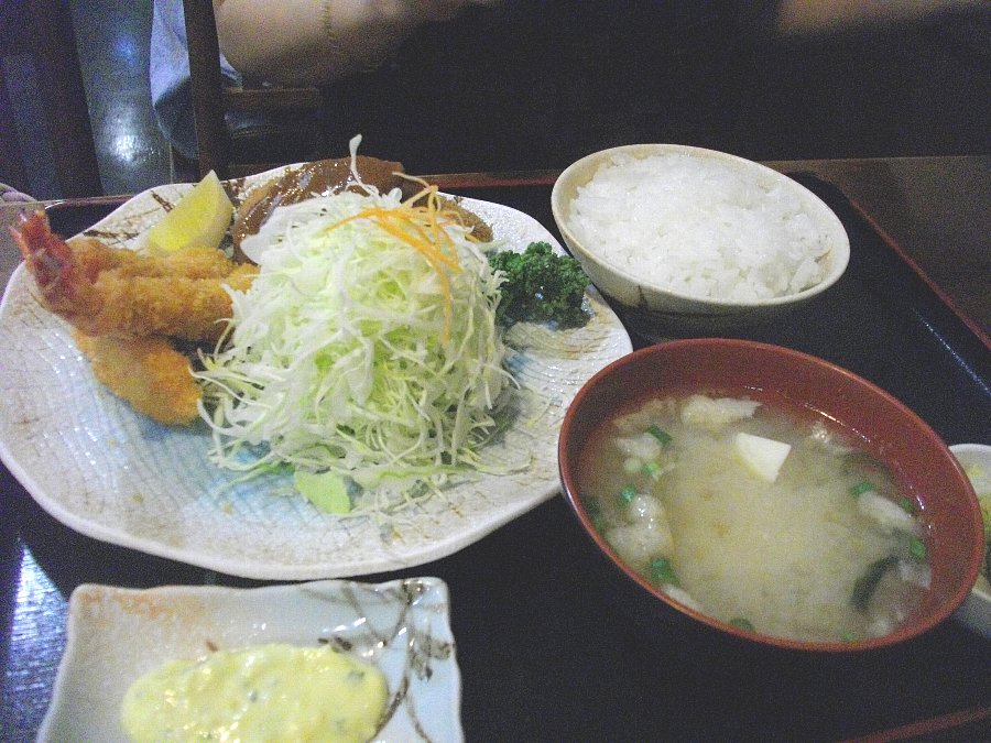 女房が頼んだのは上の看板に出ていたオススメメニューの「海老フライとチーズ入りハンバーグかつ」900円ですが海老フライが3尾ついています。