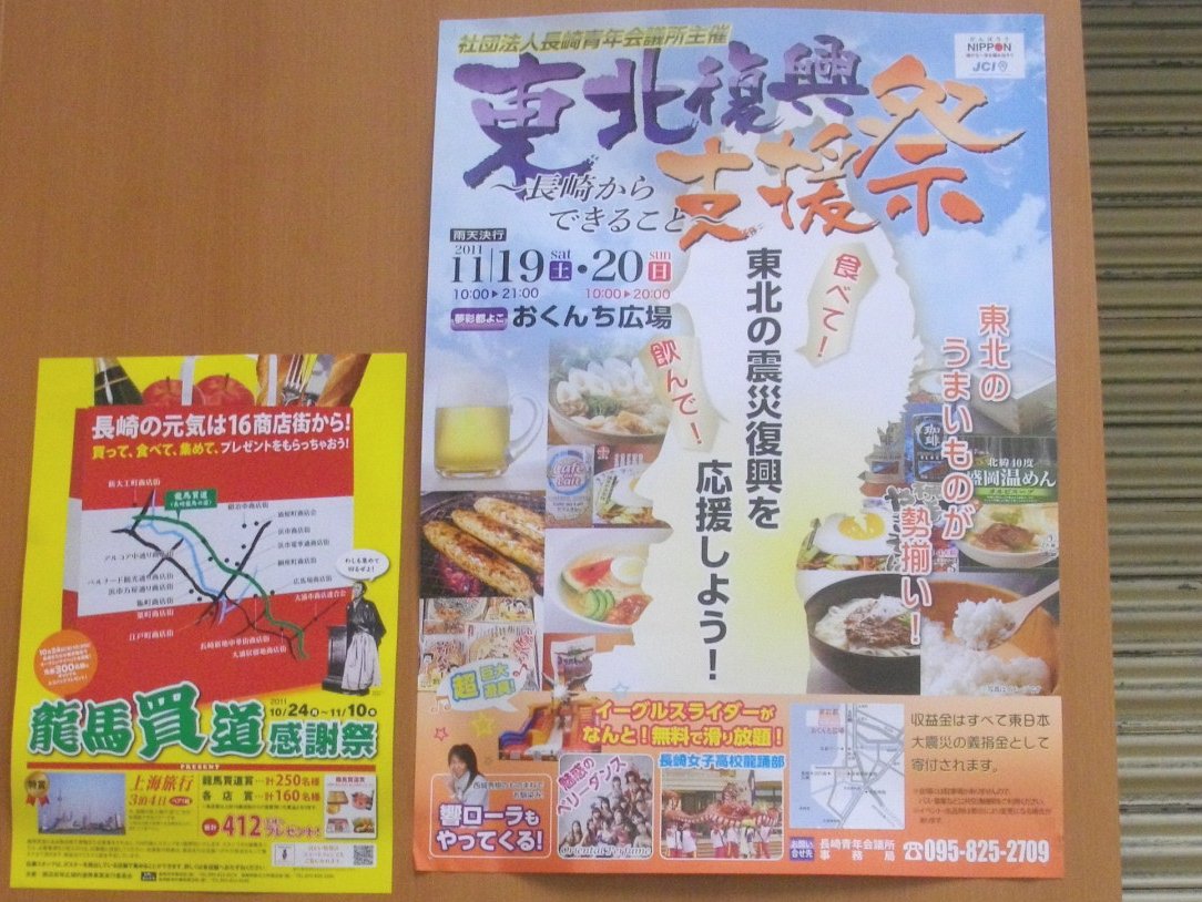 以前から小耳に挟んではいたのですが詳しい開催日時は知らなかった「東北復興支援祭」は夢彩都横の「おくんち広場」で11/19・20に行われるんですね・・・水辺の森公園で行われる「ながさき実り恵みの感謝祭2011」と同時開催でしょうからお客さんも大勢集まるでしょう。