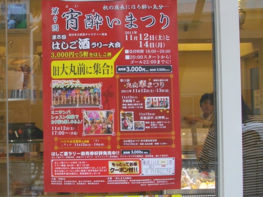 これが「宵・酔いまつり」のポスターですが11/12・14の二日開催され3千円で5軒のお店でお酒とつまみを食べることが出来るという催しです・・・毎年気になっているのですがなかなか参加できませんね
