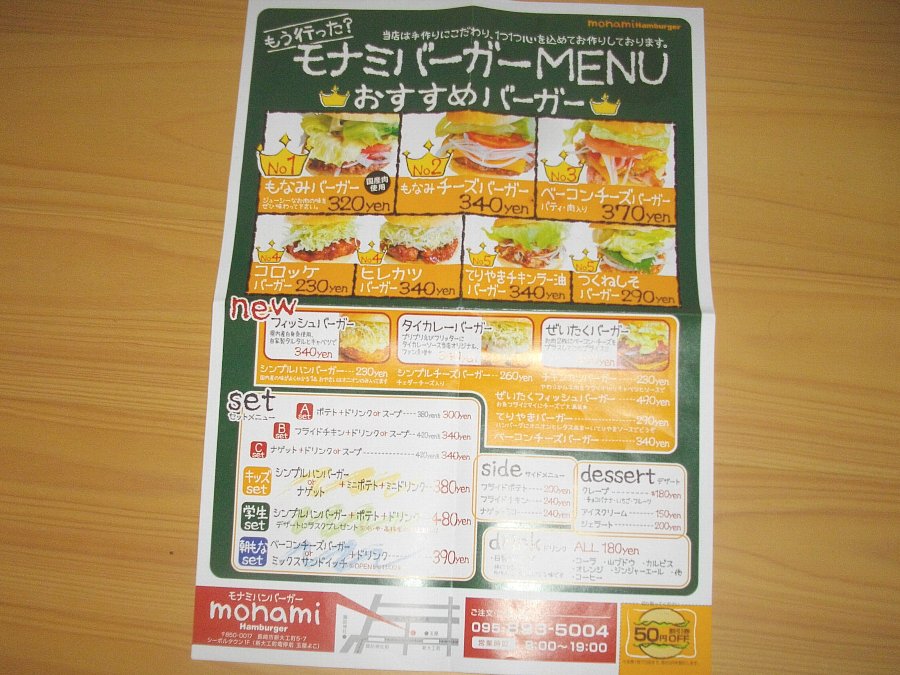 時々利用している「アイポン」のクーポンを使って長与の「ゆりの湯」に行こうかと思ったのですが調べると今日は月に一度の定休日・・・予定を変更してやはりクーポンを持っている新大工にあるハンバーガーショップの「モナミ(monami)」に行くことにしました