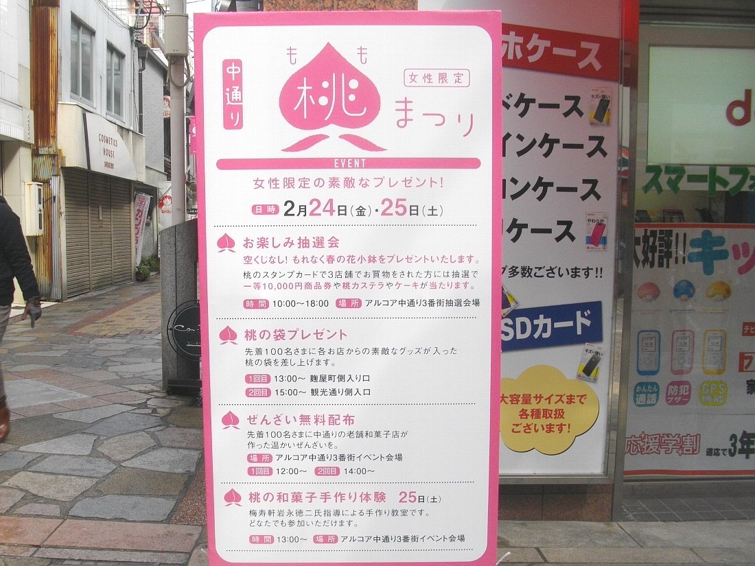 中通りの入り口に目立つピンクの案内板・・・「中通り桃まつり」というのを2/10〜3/4の期間開催しているみたいです