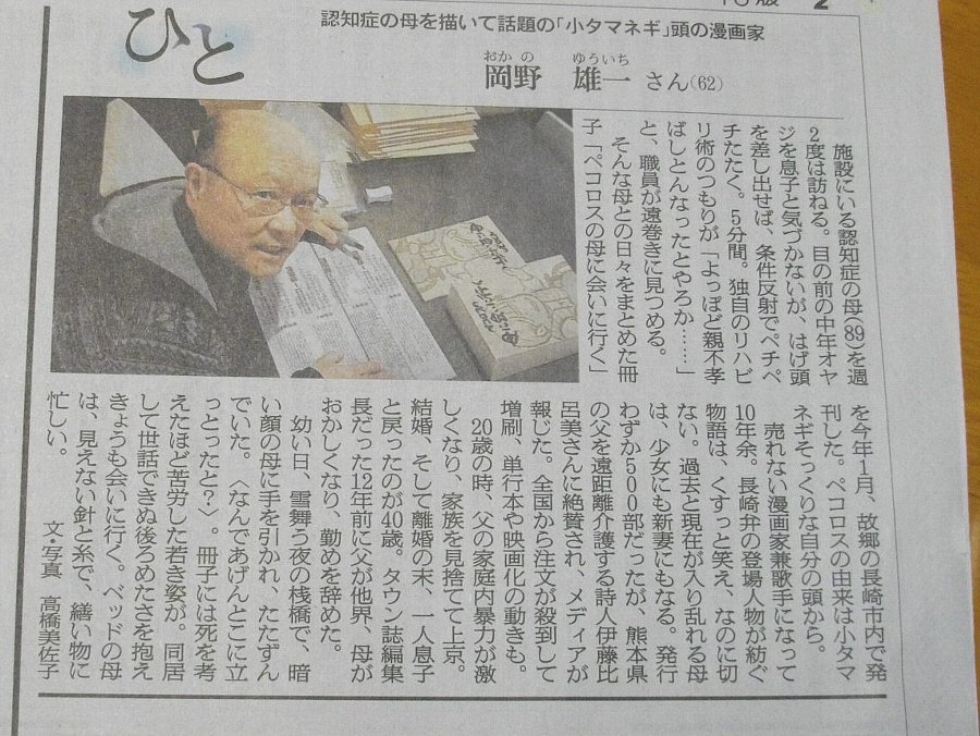 4/3の朝日新聞の2面「ひと」欄にペコロスこと岡野雄一さんが紹介されていましたね