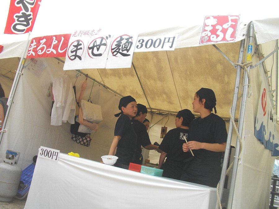 おくんち広場の真ん中にテーブルを並べて周囲にお店が並ぶというよくあるパターンですが客席にテントを張っていないのでちょっと暑かったですね