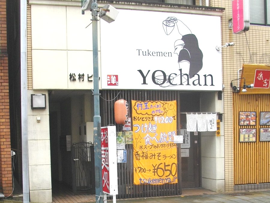 何度か食べに来た「つけ麺 洋ちゃん」の前には「つけ麺食べ放題1,200円」の看板・・・そんなに食べることはできないなぁ^^;