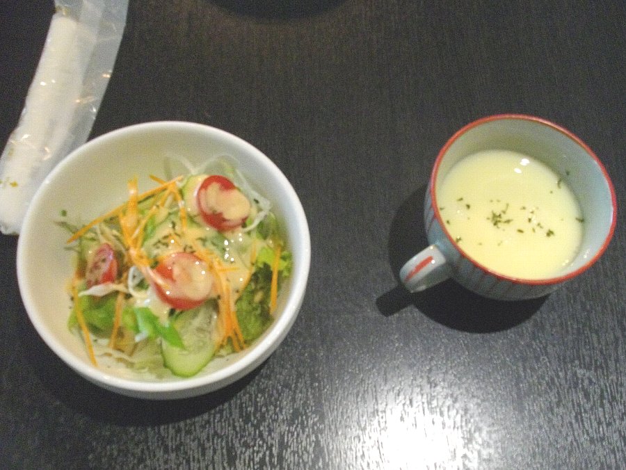 最初にサラダとスープが出ますがこの冷製スープは季候柄美味しかったですね
