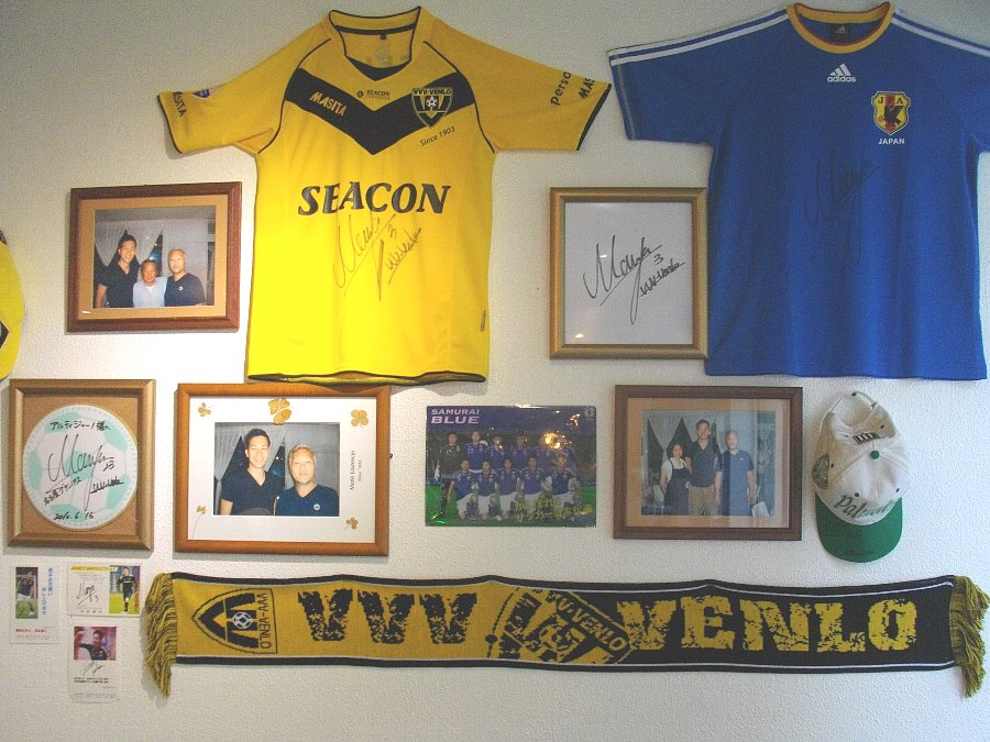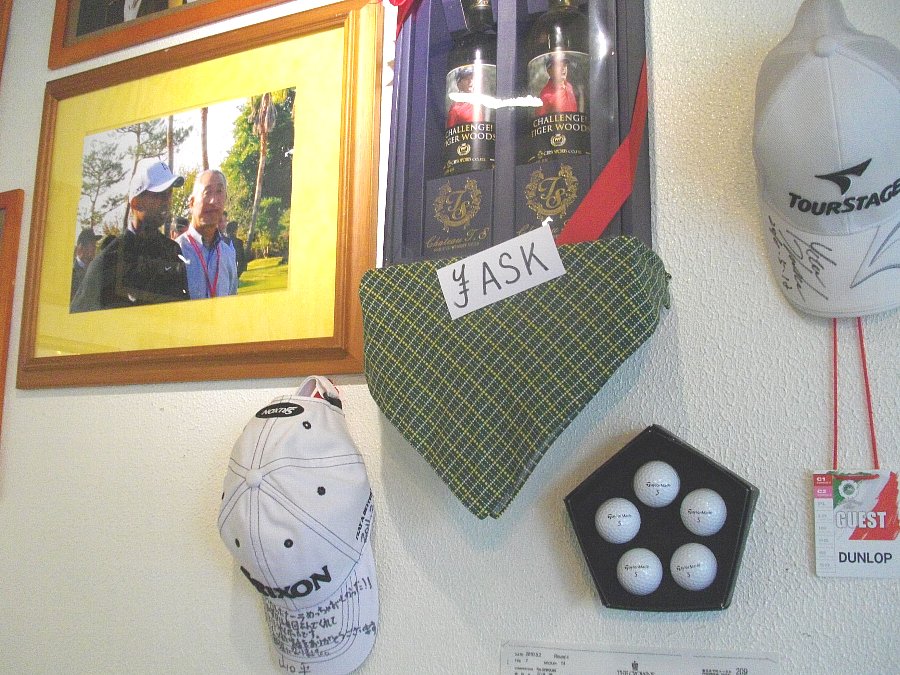 壁にはゴルフベストアマの松山選手・東北福祉大ゴルフ部監督・なんとタイガーウッズ!・サッカーの吉田麻也選手等々いろんな選手の写真やグッズなどが飾られています
