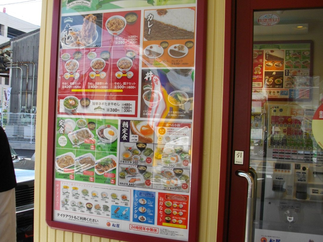 入り口にメニューが貼られていましたが松屋では牛丼じゃなく「牛めし」と言うんですね、意外と定食が多いのも特色なのかな?