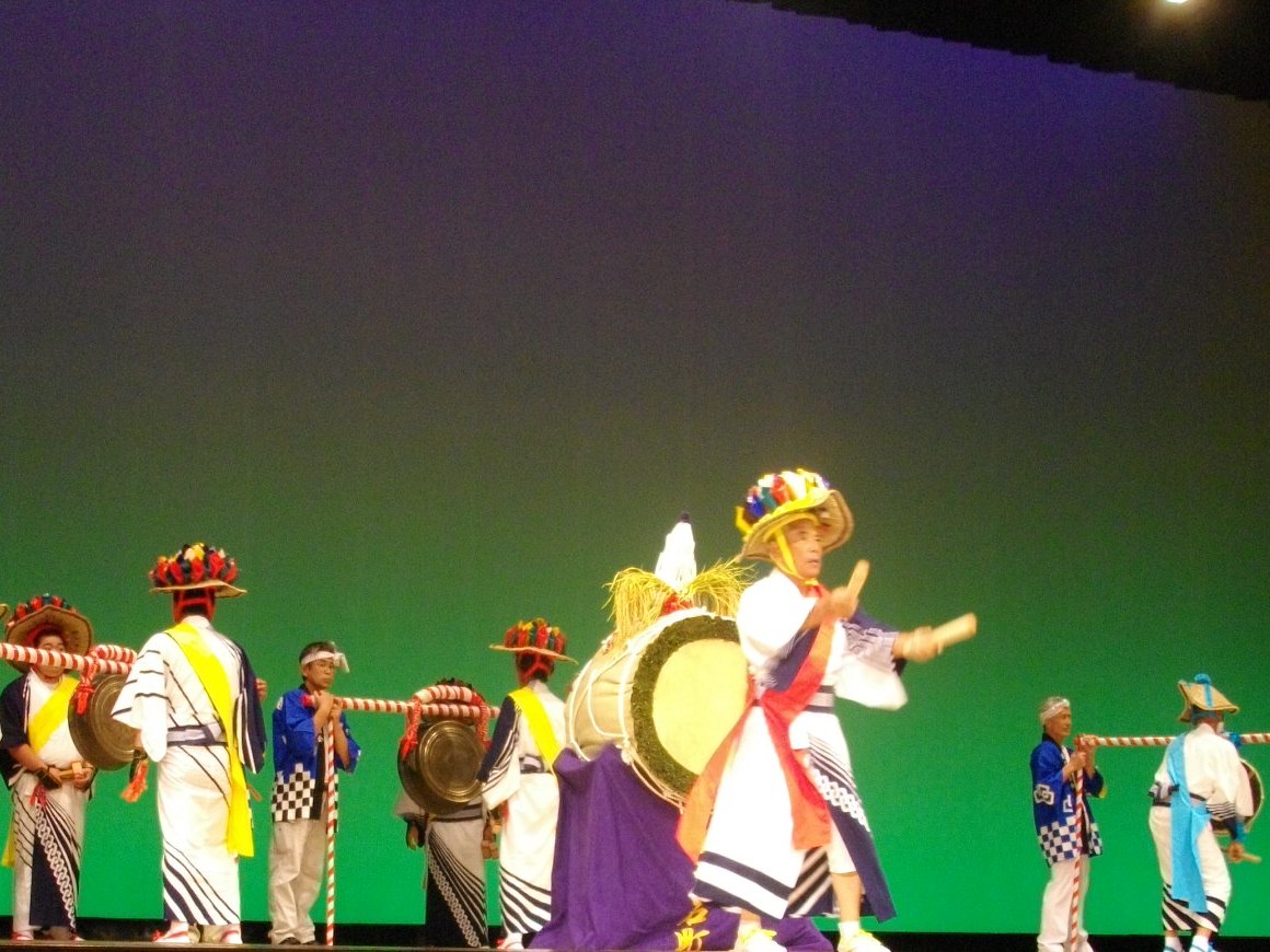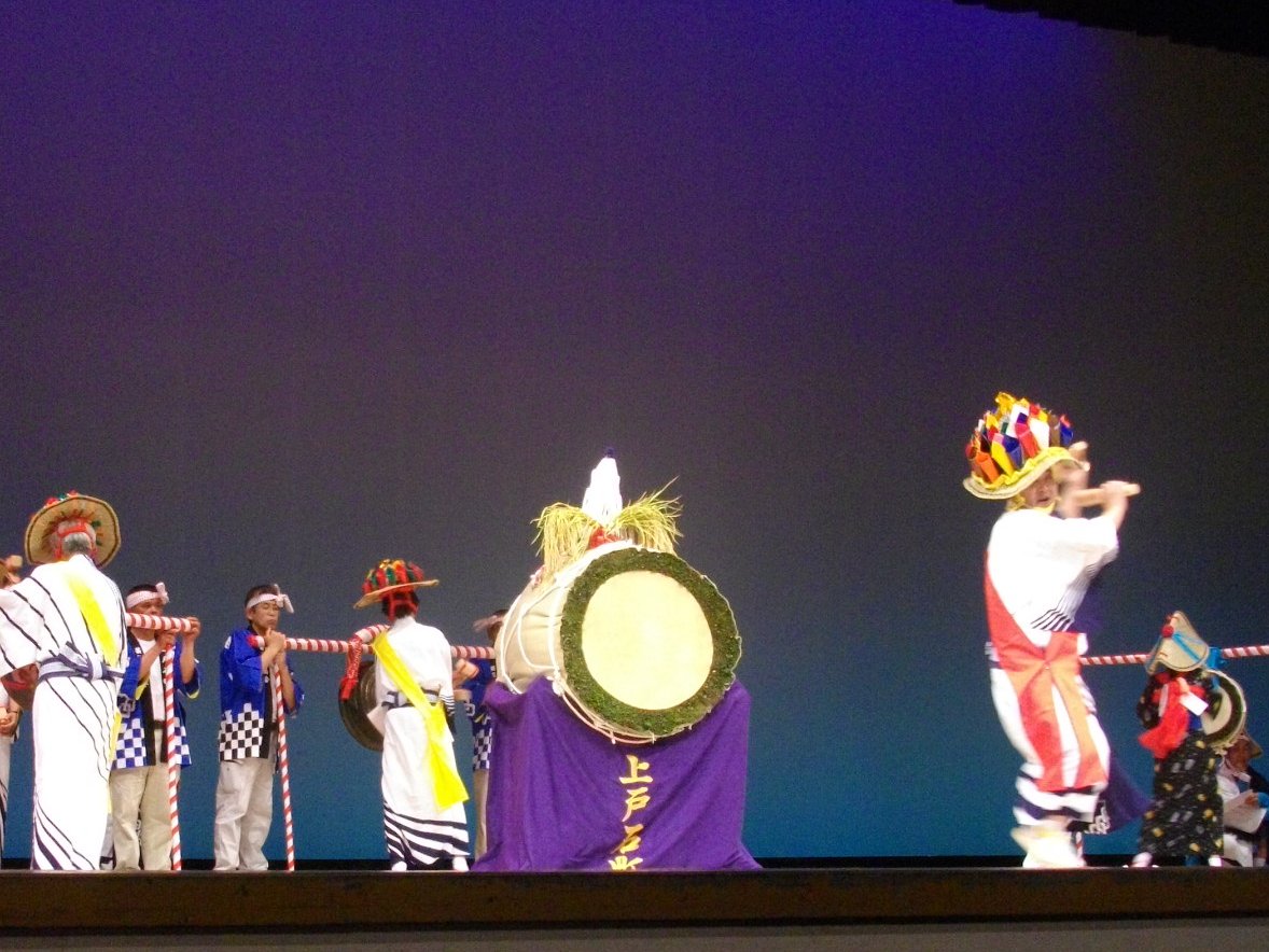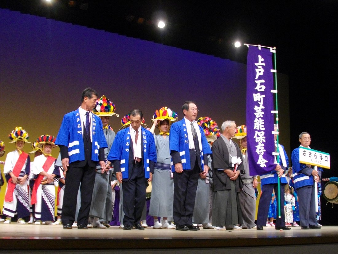 いったん緞帳が降り、再び上がったら「上戸石町 ささら浮流」の人たちが並んでいました