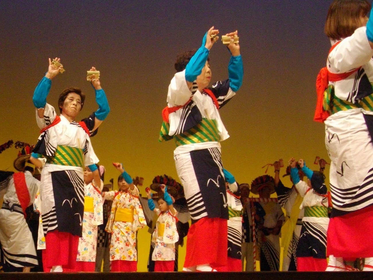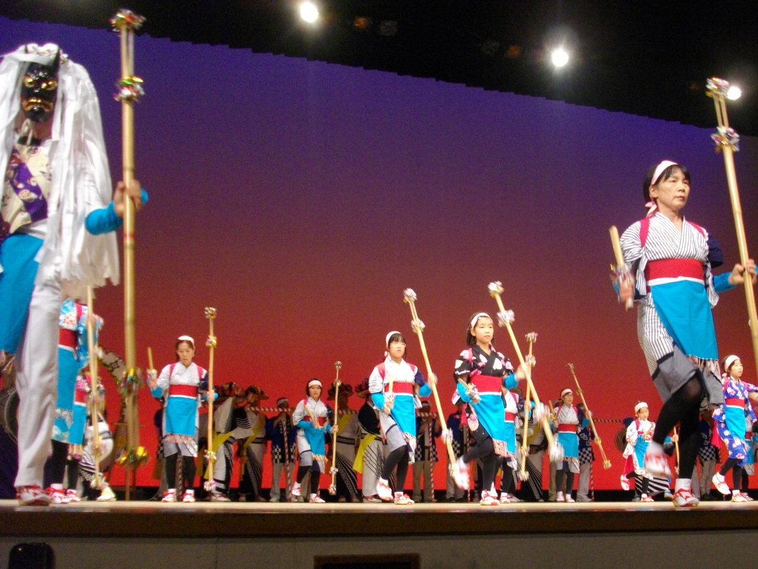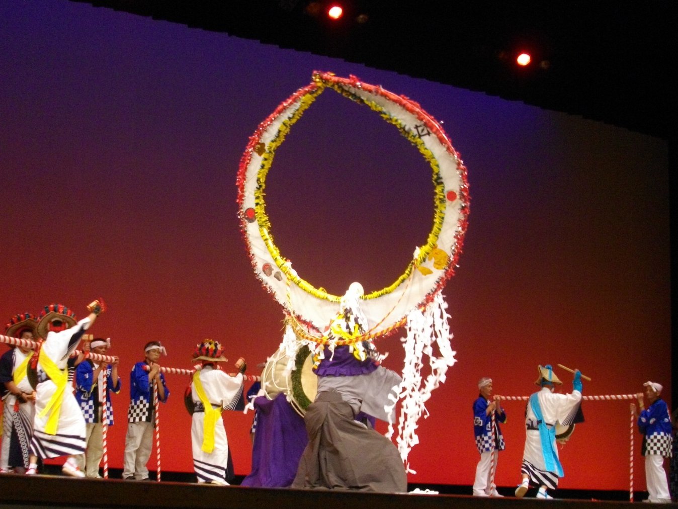 いったん緞帳が降り、再び上がったら「上戸石町 ささら浮流」の人たちが並んでいました