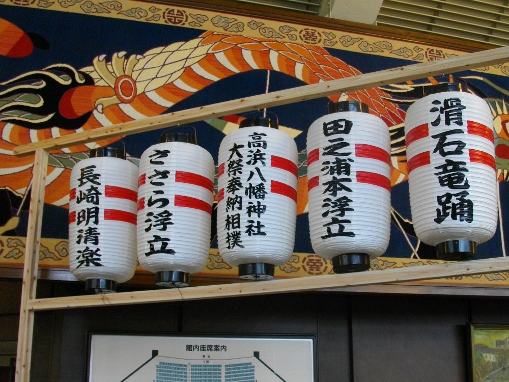 公会堂の中は長崎くんちの踊り町みたいな提灯が飾っていました