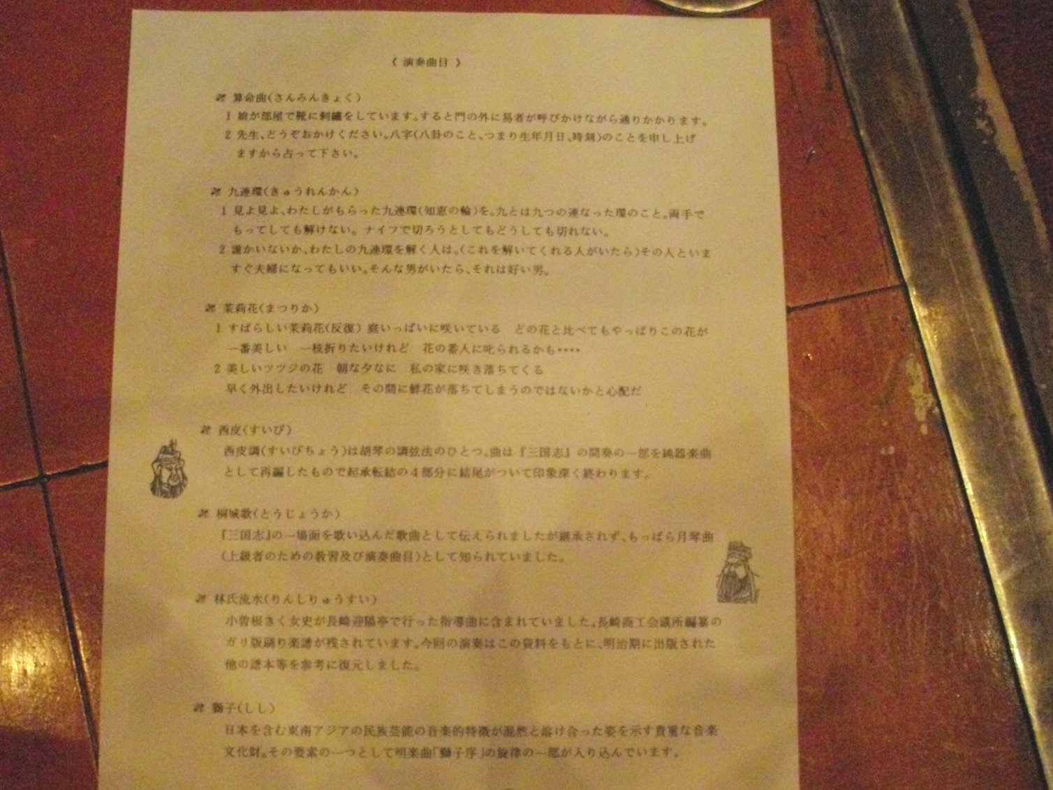 いろんな楽器が登場しますがやはりメインは「月琴」・・・でも最近よく若い演奏家がやるのと違ってこの「長崎明清楽保存会」で使用されている月琴は100年以上昔の古楽器だそうです