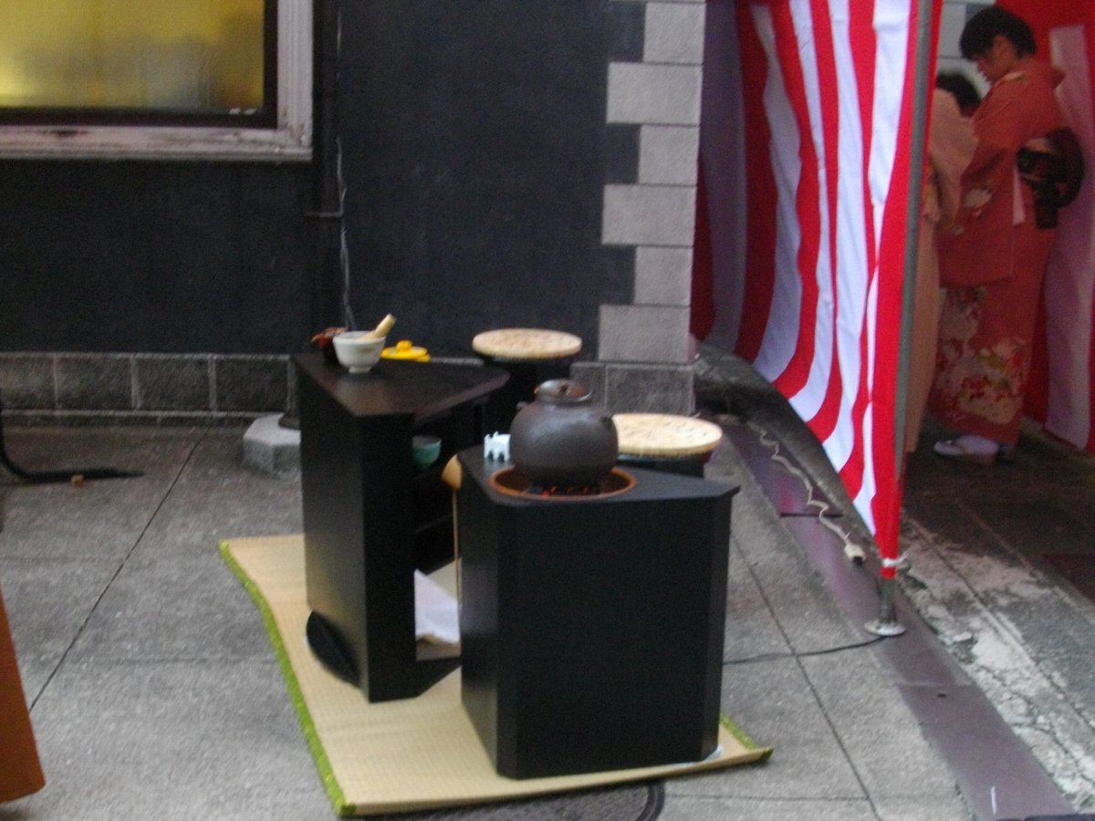 到着すると店先で抹茶の無料サービス(^^) 玉園町の迎陽亭でもお茶を頂くことは出来たのですが有料だし何より座敷に正座しなくちゃいけないので遠慮しましたが、ここではベンチを用意してくれていたので気楽に戴けました