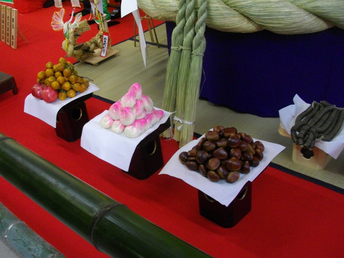 しょうがないので当たり前のお供え物・・・俗に「くり・かき・まんじゅう」という3点セットにザクロも並んでいます