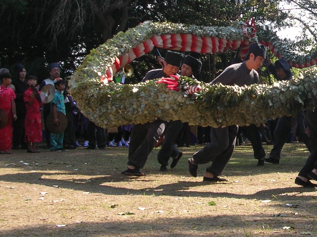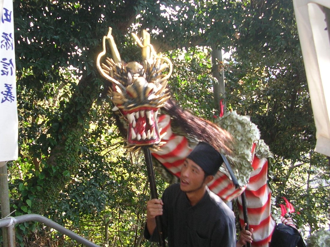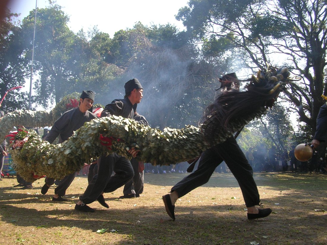 さぁ独特の音楽と爆竹の煙の中お待ち兼ねの「角上蛇踊」の登場です