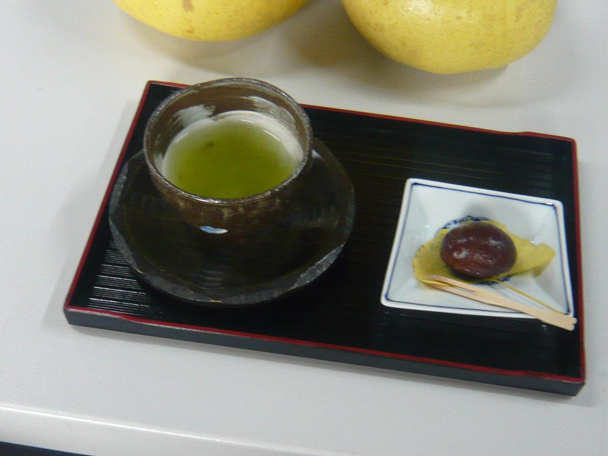 お茶と「栗のワイン漬け」を戴きましたが子供には「九十九島煎餅」でした