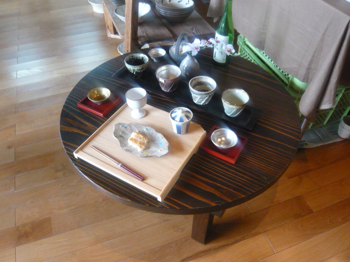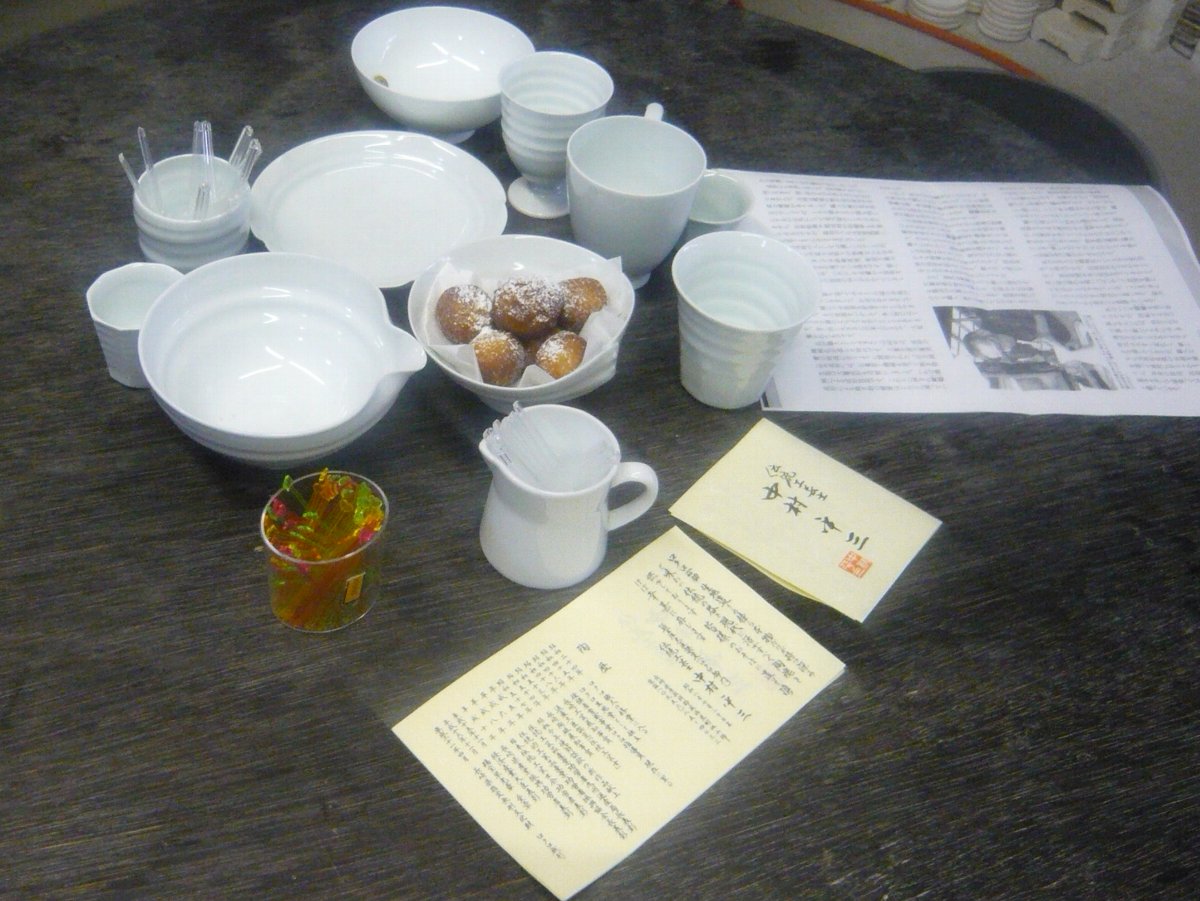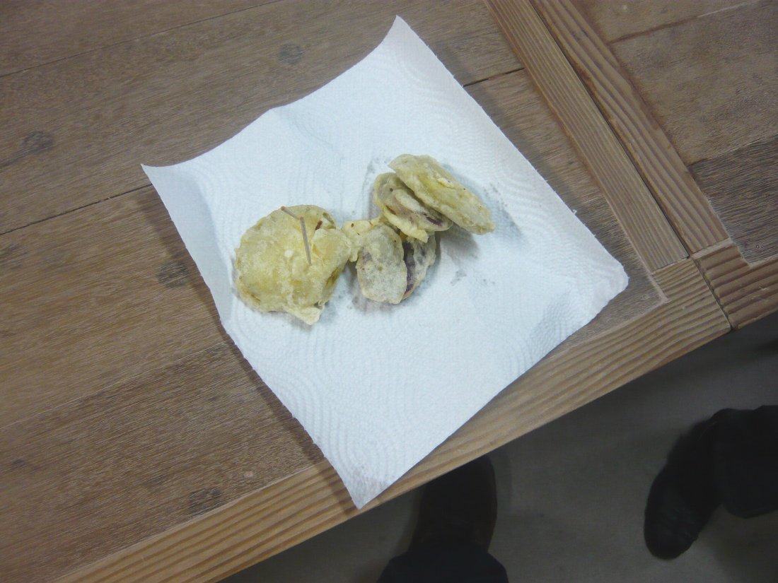 おもてなしの「芋のてんぷら」は普段は陶芸教室が行なわれているというテーブルで戴きました