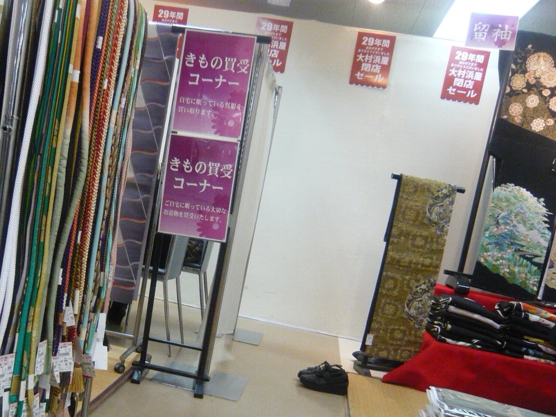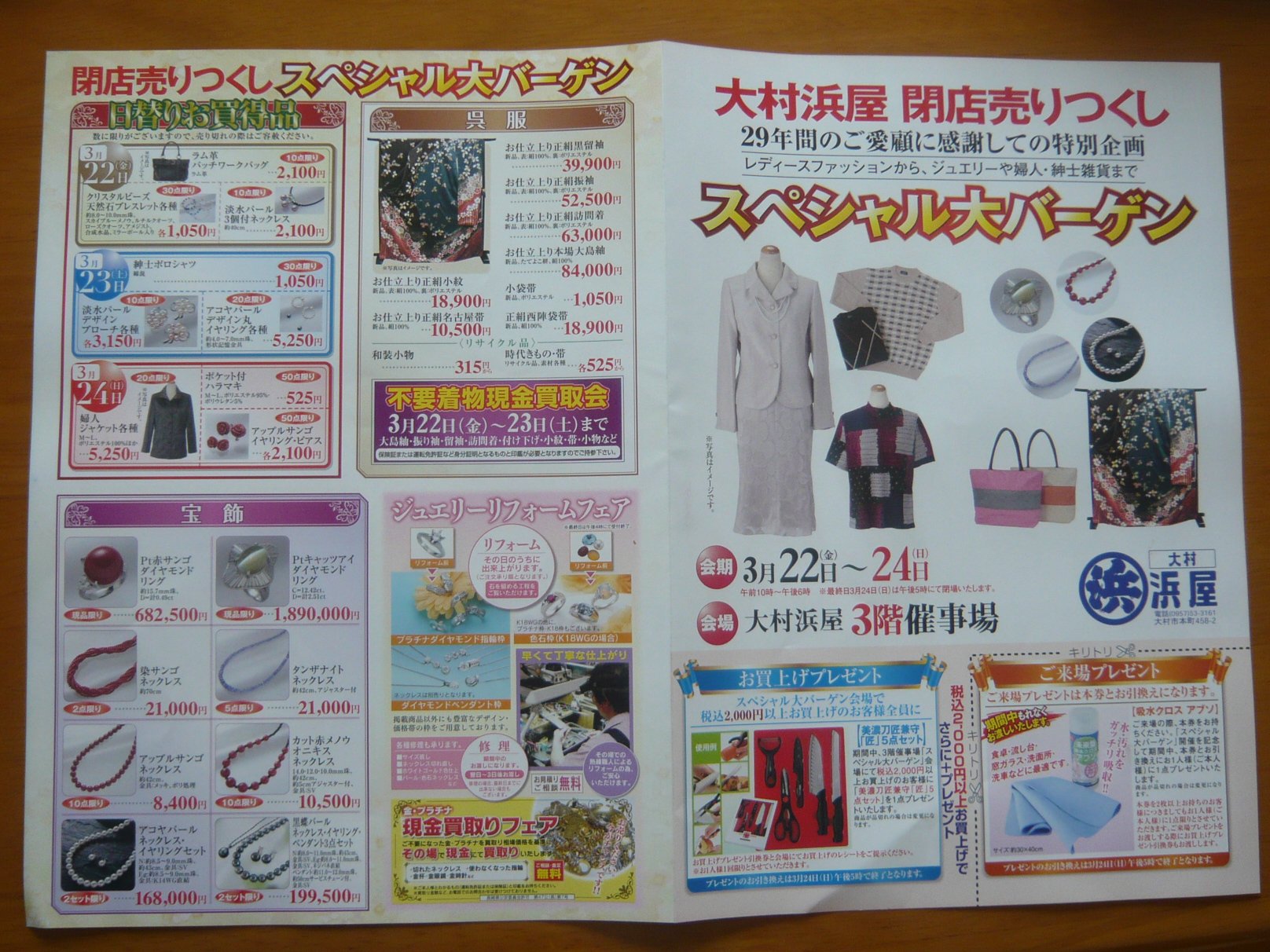 これが「大村浜屋閉店売りつくし スペシャル大バーゲン(^^;)」のチラシですが右下に来場者にもれなくプレゼントというのがあり、さらには滅多に見ない「和服の現金買取り」というのがあるのでちょっと混んでいるかなと思いながらも行ってみることにしたのです