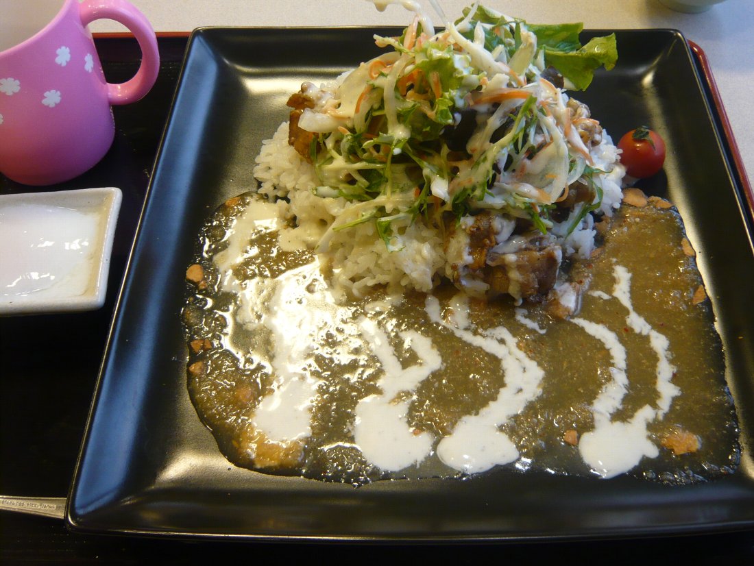 ライスの上に生野菜が載っている料理なんて初めてだと思いますが肉や左にある温玉を混ぜて食べると思った以上に美味しかったですね、これだとトルコライス以上に家庭で簡単に作れるので今度作ってもらおうかなと思ったくらいです