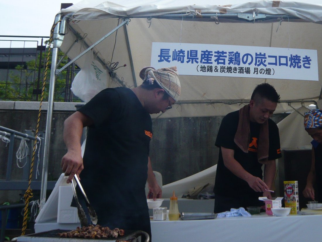 次はステージのすぐ隣でやっていた鍛冶屋町通りの「月の燈」が「若鶏の炭コロ焼き500円を先着10名の100円!」とさらなる大サービス(゜o゜)