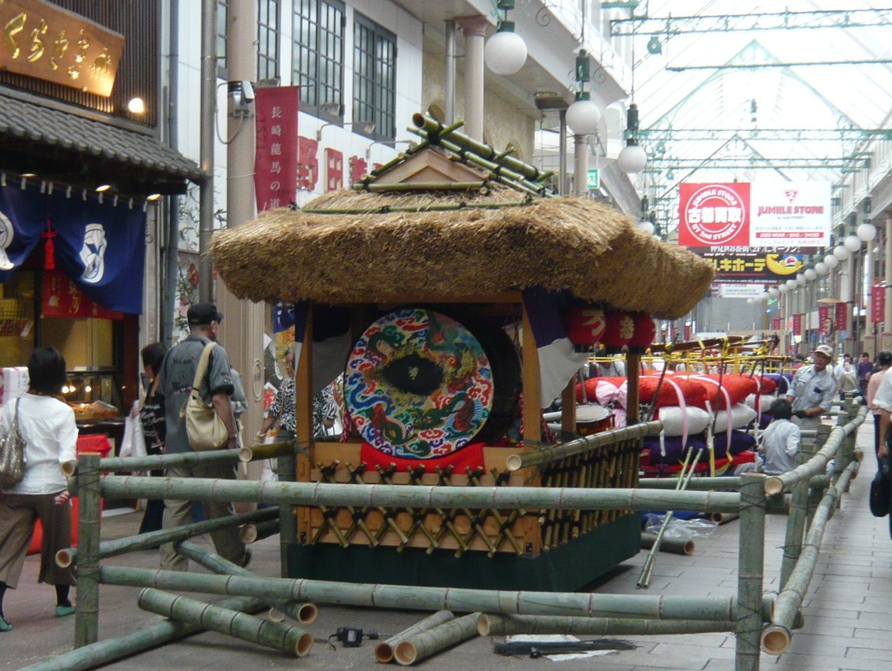 観光通にやって来ると万屋町がアーケードで演し物である「鯨」や傘鉾を飾る準備をしていました・・・これは囃し方が乗る「納屋」ですね