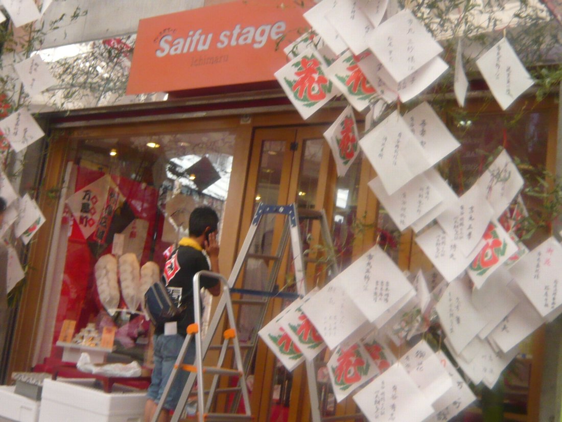 万屋町の老舗「バッグの市丸」がやっている「サイフステージ」もお店を閉めて飾り付けの準備中