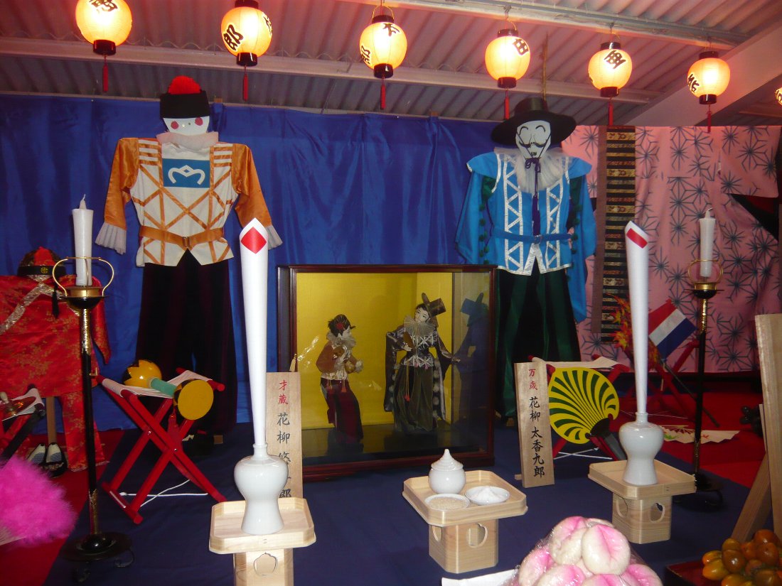 先ずやってきたのは栄町の電車通り沿いにある長崎銀行本店駐車場ですが、ここには演し物の「阿蘭陀万歳」の衣装などが展示されていした