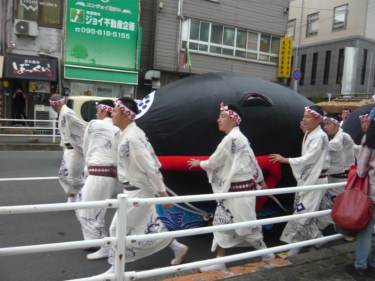 「鯨」を先頭に囃し方が乗る「納屋」さらにその後には「ざい船」「羽差船」などの船頭船が続くのでくんちの演し物の中でも群を抜く大行列です