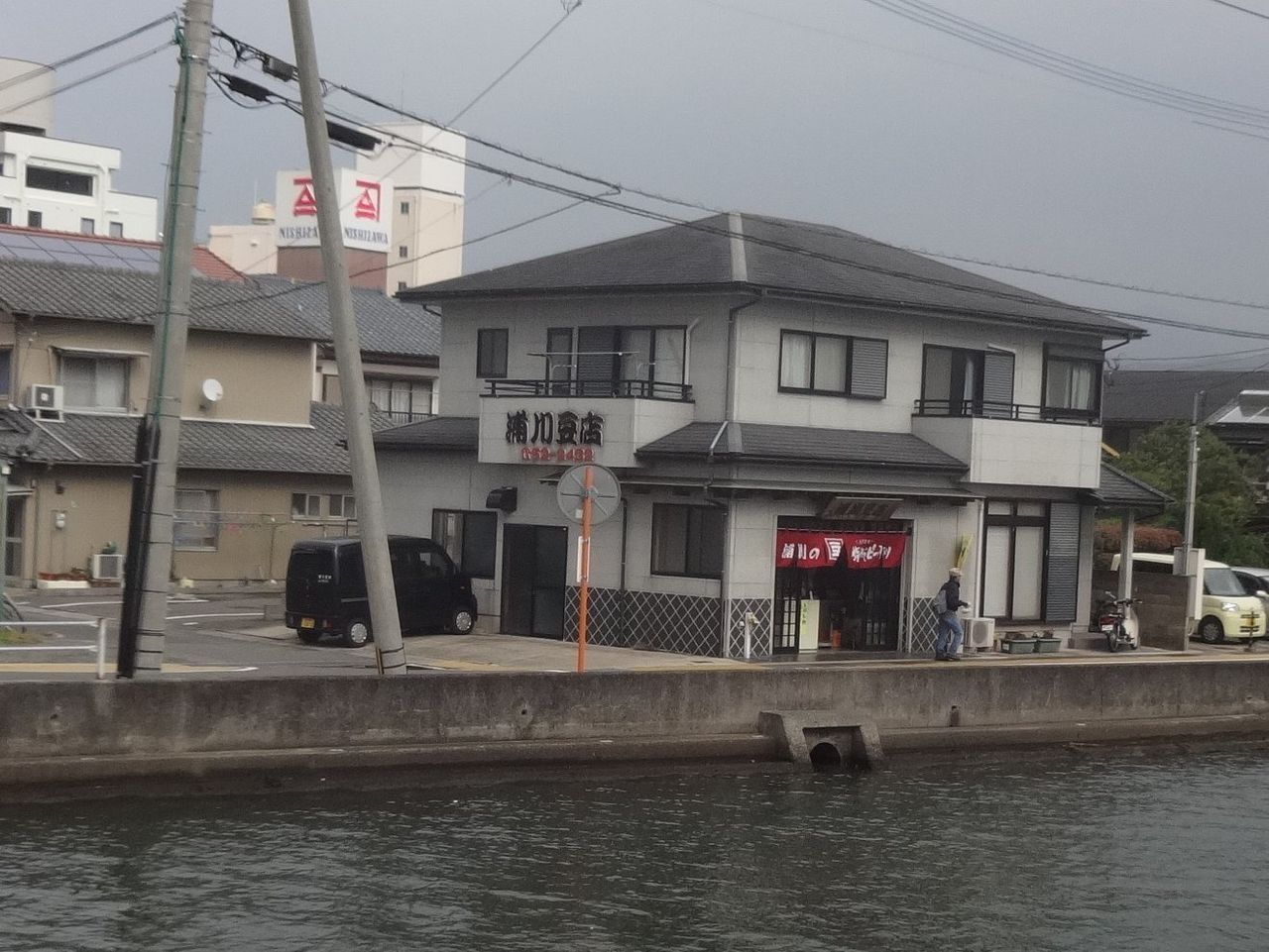 西本町に入ると川沿いに大村名物「ゆでピー」の老舗「浦川豆店」があります