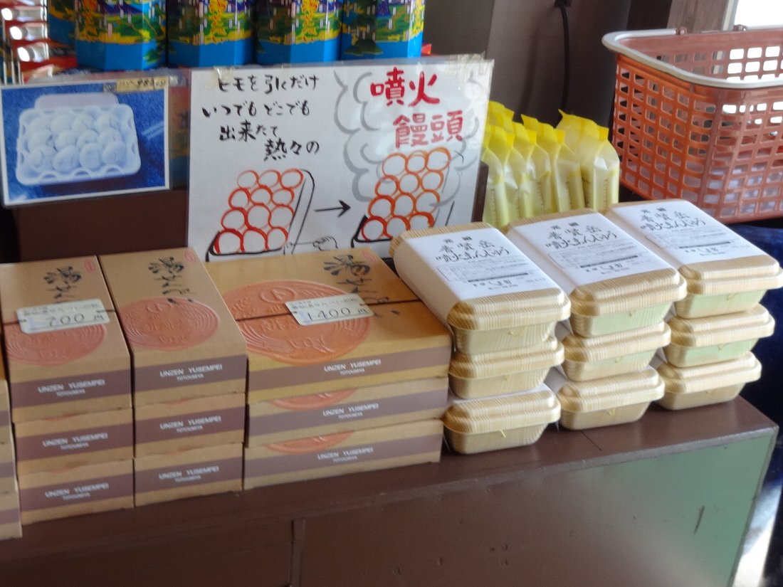この「噴火饅頭」というのは初めて目にしたと思いますがこの後寄った何軒かのお土産屋さんにはどこも山積みしていましたから最近の人気お土産品なんでしょうか