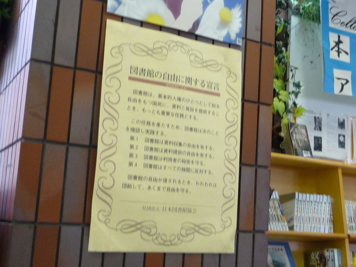 柱に「図書館の自由に関する宣言」が貼っていました・・・ずっと以前に読んだ「図書館戦争」のモチーフとなった「宣言書」ですが実物を目にしたのは多分初めてでしょう