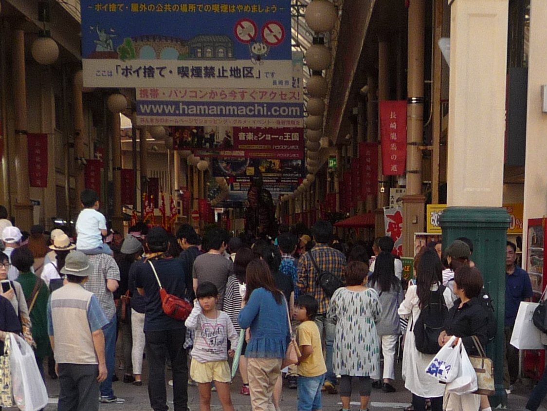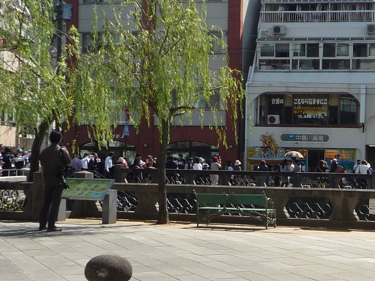 観光通りの入口付近で「五嶋町 龍踊」が庭先回りをしていたので大観衆^^;