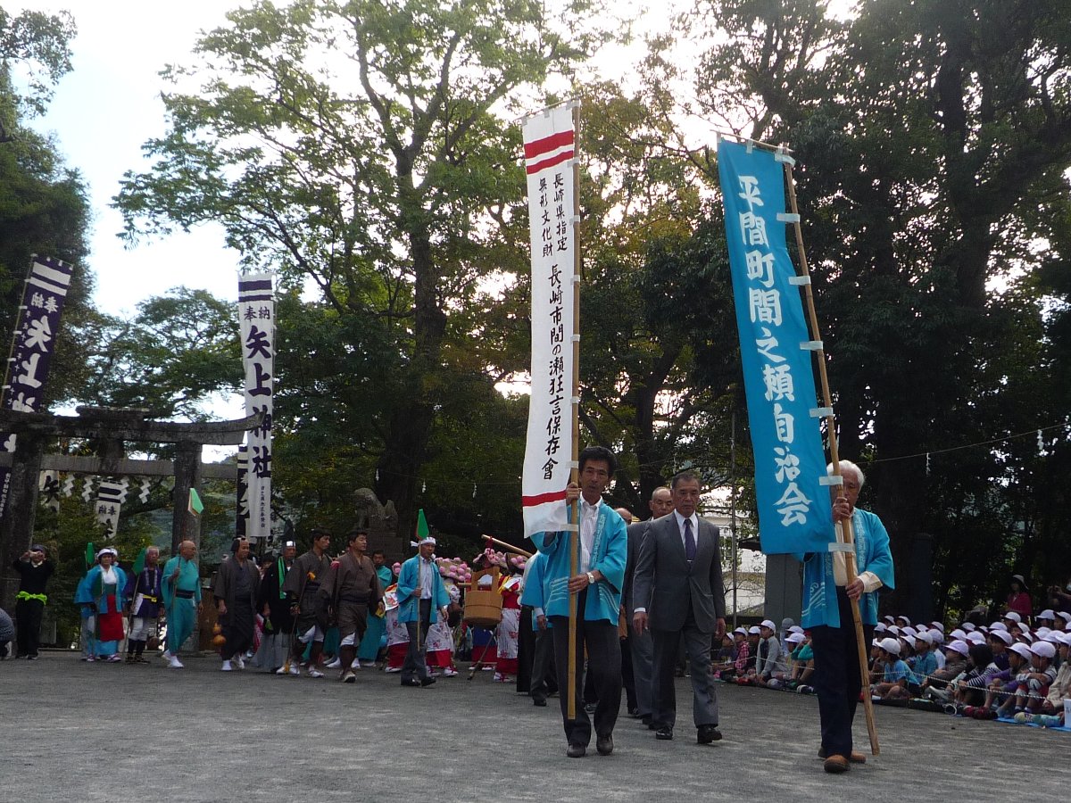 いよいよ「平間町間の瀬自治会」「長崎県指定無形文化財 長崎市間の瀬狂言保存会」の幟を先頭に入場です