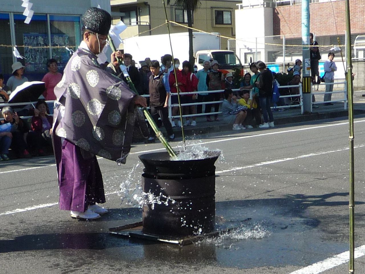 例によってお旅所前の国道は通行止めになっていて道路の真ん中には「湯立神事」に使用するお湯が沸いていました