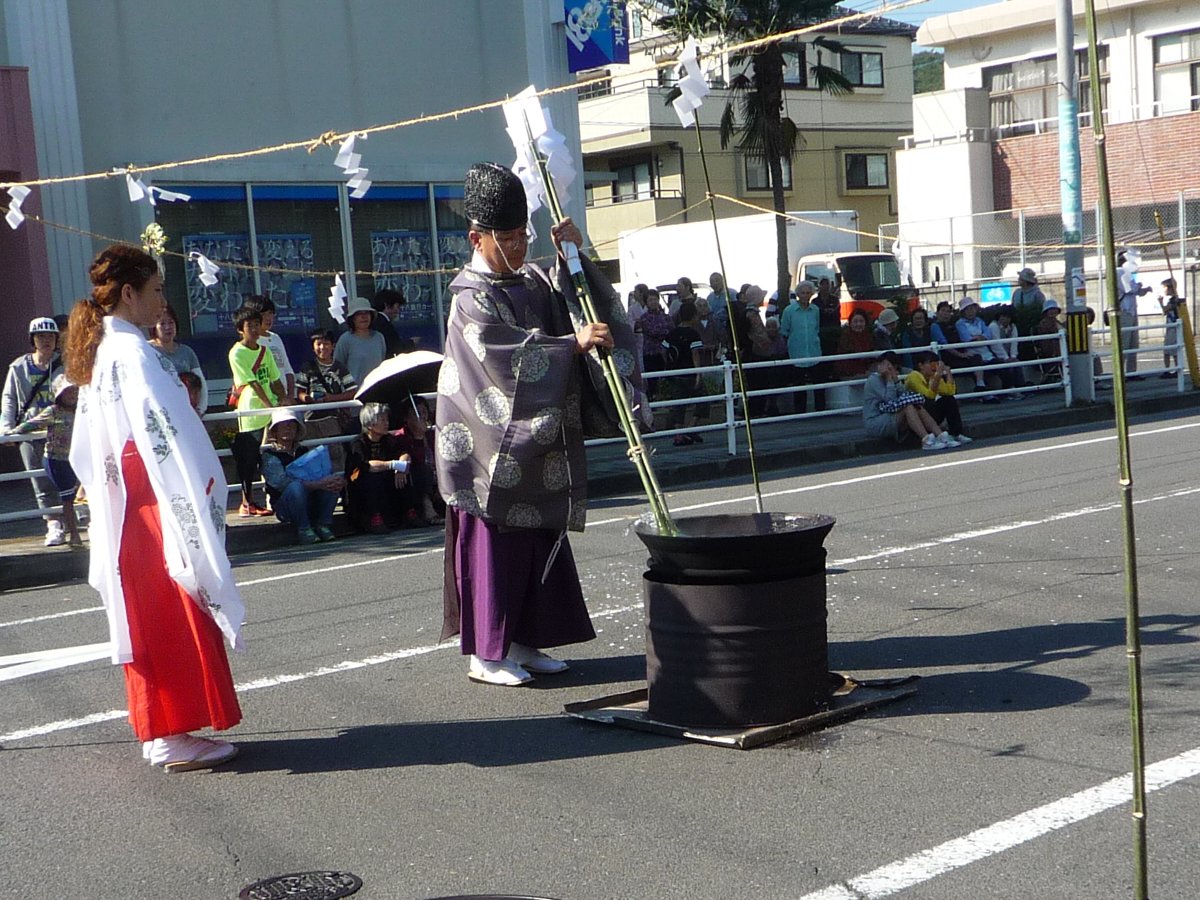 午後2時を回ると先ず巫女さんがお湯の前で鉾先鈴を鳴らし