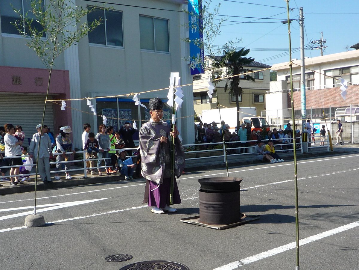 この後一旦仮宮での儀式を行い最後に登場した方は竹を手にしています