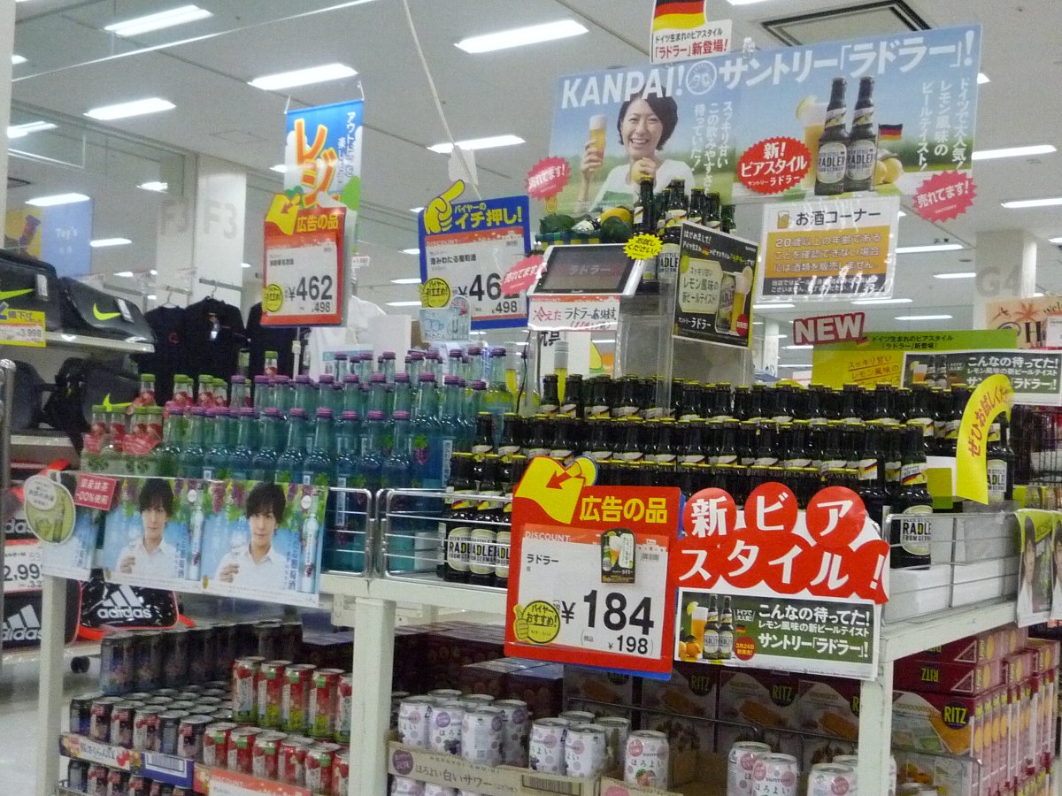 売り場に山積みしていたのは「ラドラー」というサントリーの新しい「発泡酒」みたいな飲み物ですが「ドイツで大人気」だそうです・・・その隣にはテレビでCMを見たことがある「澄みわたる葡萄酒」というものも並んでいました