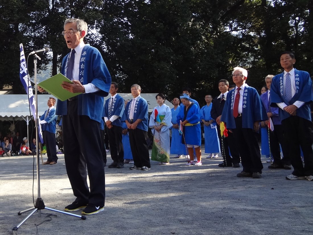 主催者代表の方の挨拶の後さっそく平間町「矢上平野浮立」の奉納踊のスタートです