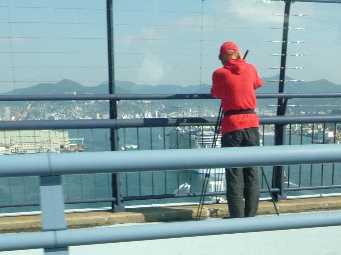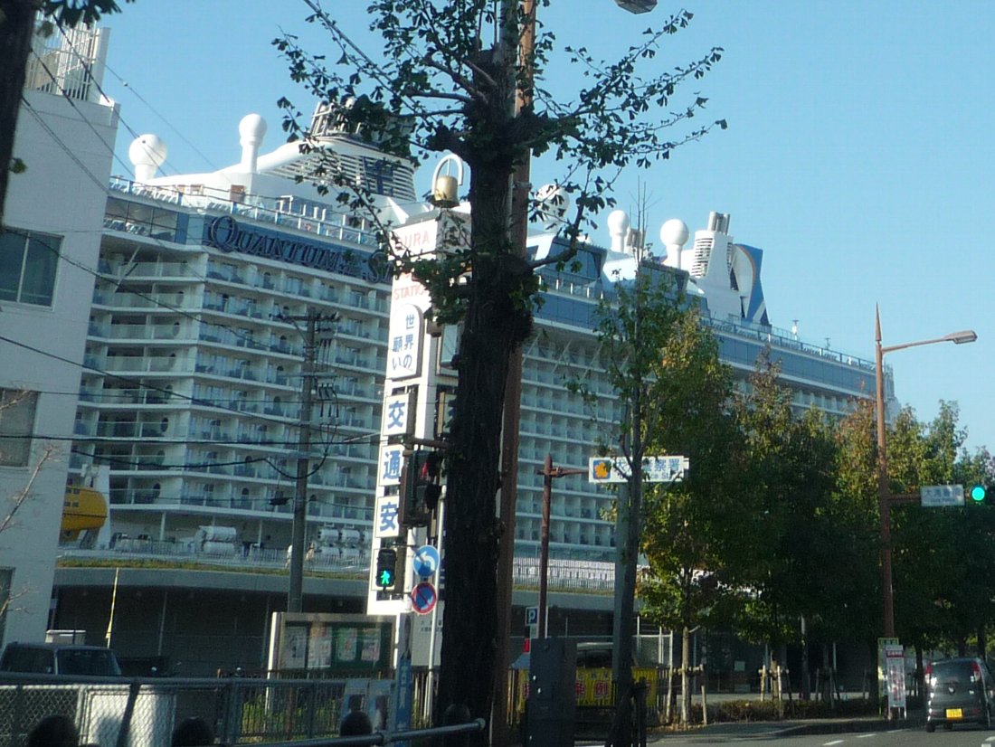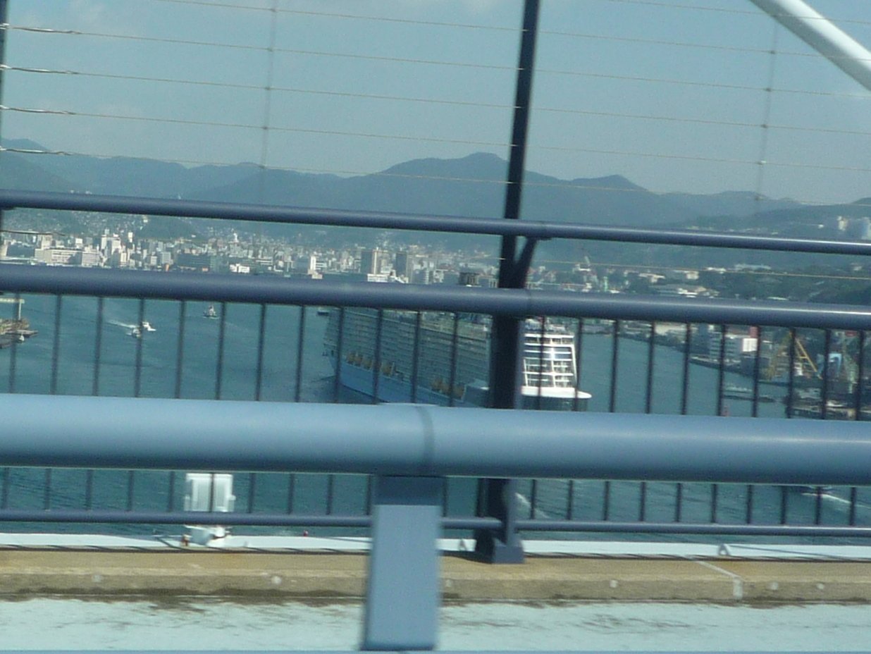 橋の上には写真を撮りに来ている人が何人もいます・・・チラッと見ただけですが大きさと独特の船体からして以前も来た世界でも最大級の大型客船である「クァンタム・オブ・ザ・シーズ」かな?
