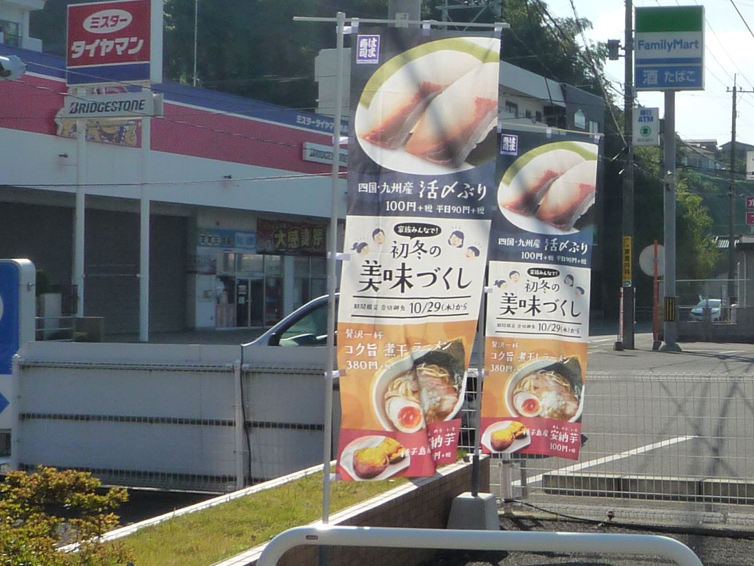 小ヶ倉のはま寿司前で目に留まったのは「ラーメン」の幟ですがそういえばずっと以前にも「はま寿司時津店」でラーメンを食べようと思ったら完売していたことがありましたね