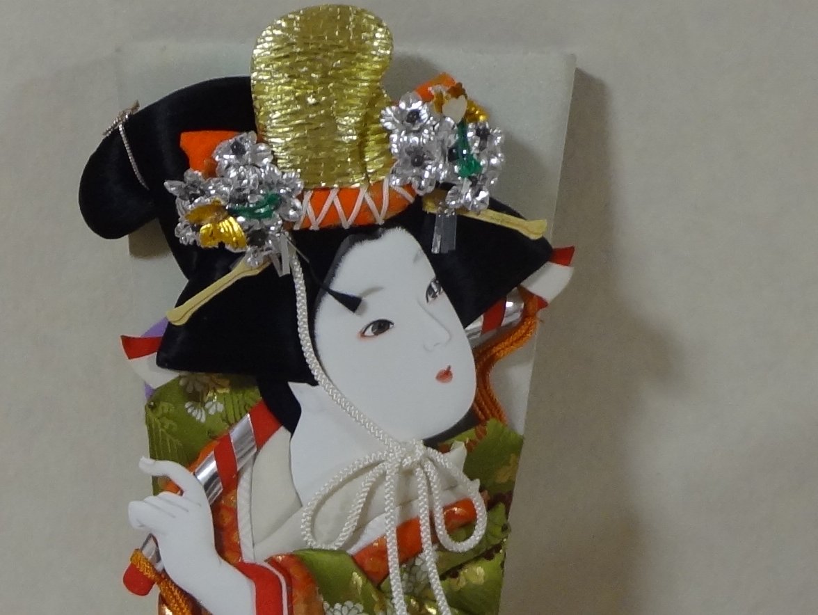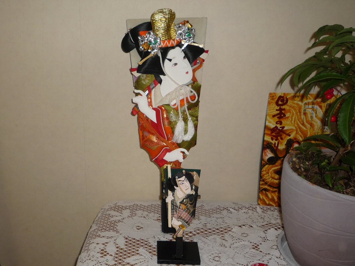 大きいのは私の娘が生まれた時に当時「音羽屋」という羽子板店でアルバイトしていた友人に頼んで購入&送付して貰った「汐汲」です・・・ちなみに私の弟の娘(つまり姪)も同じころに生まれたのでそちらにも「藤娘」を送ってもらいました