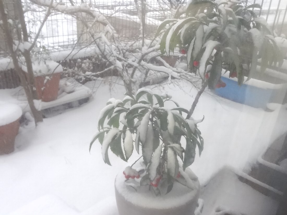 庭の植物も雪を被っていますが「マンリョウ」に雪は意外と似合いますね(^^;